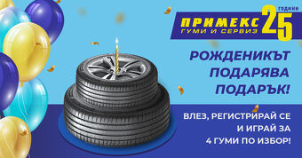 „ПРИМЕКС“ ЕООД има рожден ден и затова подарява подарък! По случай своята 25-та годишнина подаряваме един комплект от 4 летни или всесезонни гуми, по Ваш избор, на обща стойност до 1000 лева с ДДС!